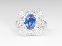 Make a timeless statement with this beautiful Sapphire Ring surrounded with Diamond Baguettes! Crafted with a breathtaking cornflower blue sapphire in the center in a faceted oval shape, this one-of-a-kind piece will have everyone turning heads for its classic and chic look. Boasting both luxury and sophistication, this statement ring is perfect for special occasions and everyday wear.
