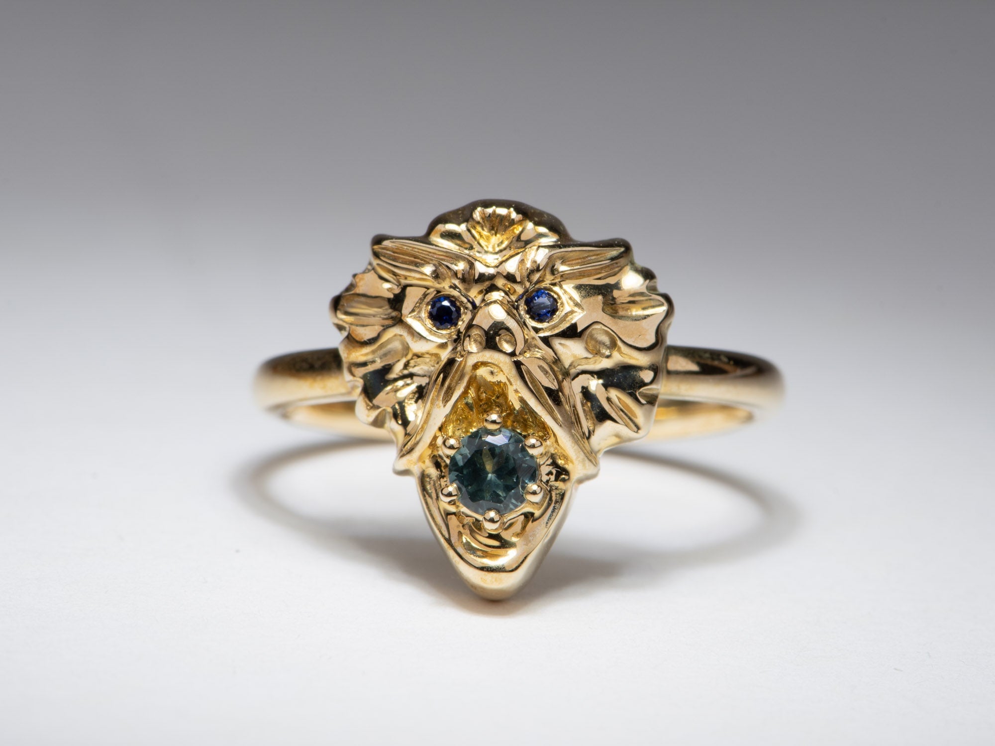 ♥ Solid 9K Gold Gargoyle Ring with Montana Sapphire Mouth Blue Eyes Vintage-Inspired Heavy Dragon Like Mythical Animal R6806