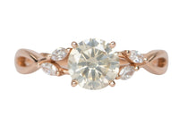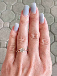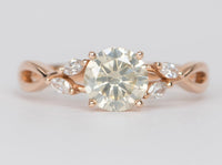 ♥ A solid 14K rose gold ring set with a champagne colored salt and pepper diamond set in the center of a nature-inspired band that is adorned with four leaf-shaped white diamonds
