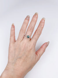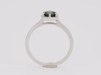 ♥ Solid 14K white gold ring set with a dark teal blue Nigerian sapphire, in a milgrain edge design with diamonds on the band
