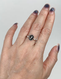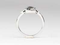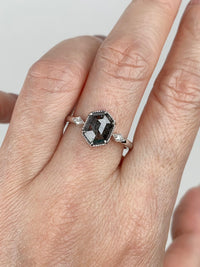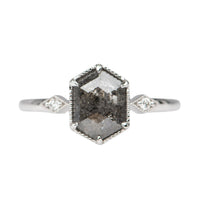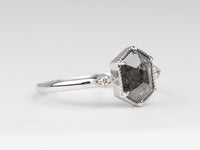 ♥ Solid 14K white gold ring set with a hexagon-shaped salt and pepper diamond in the center, flanked by brilliant cut round diamonds set in a milgrain design.
