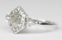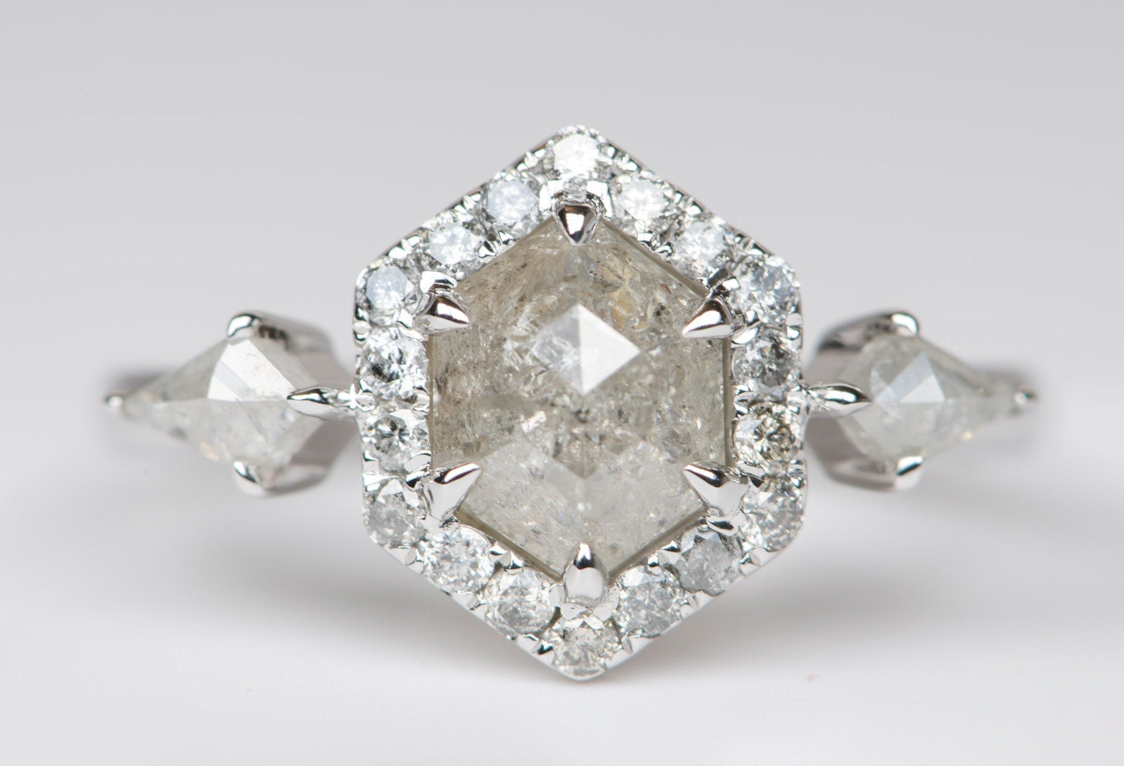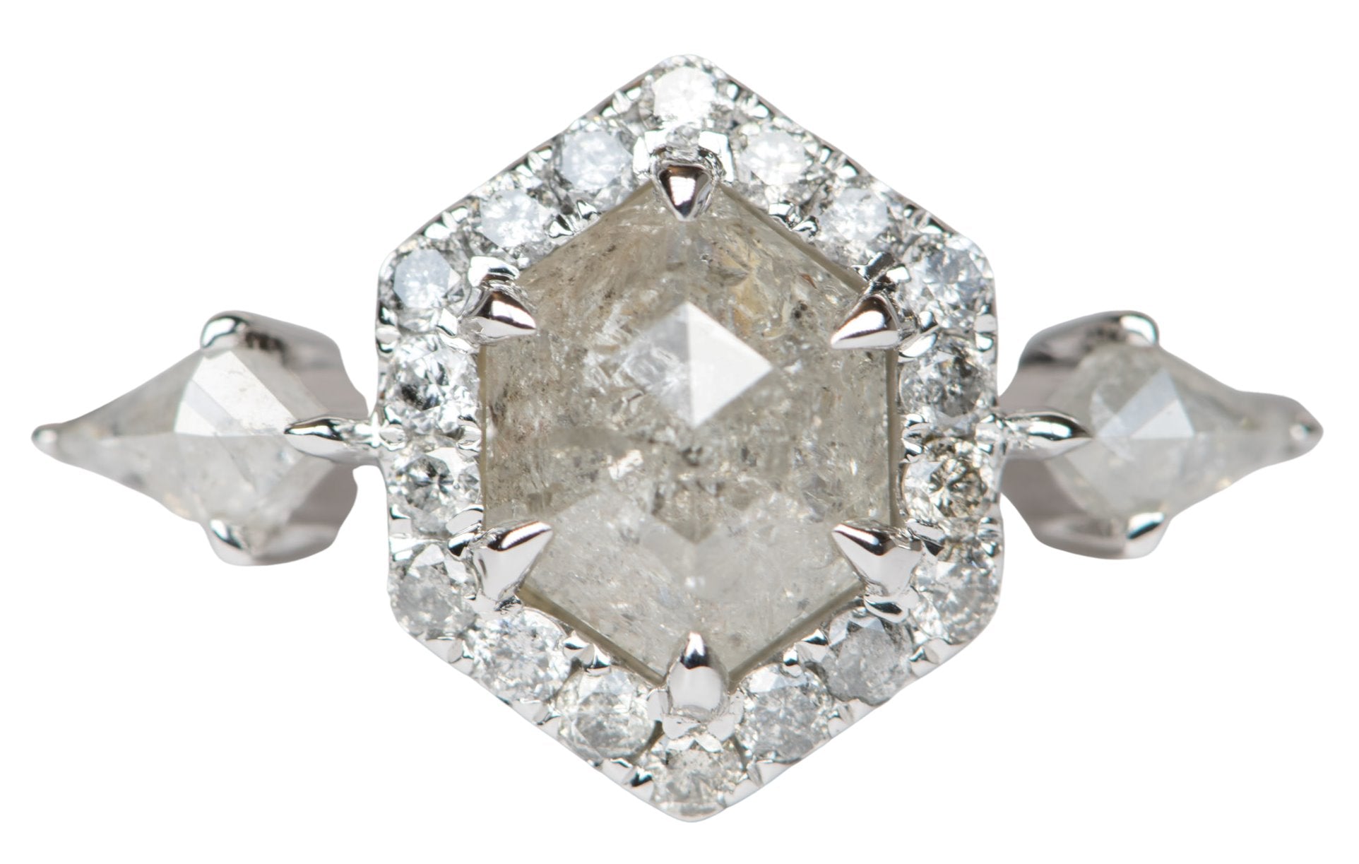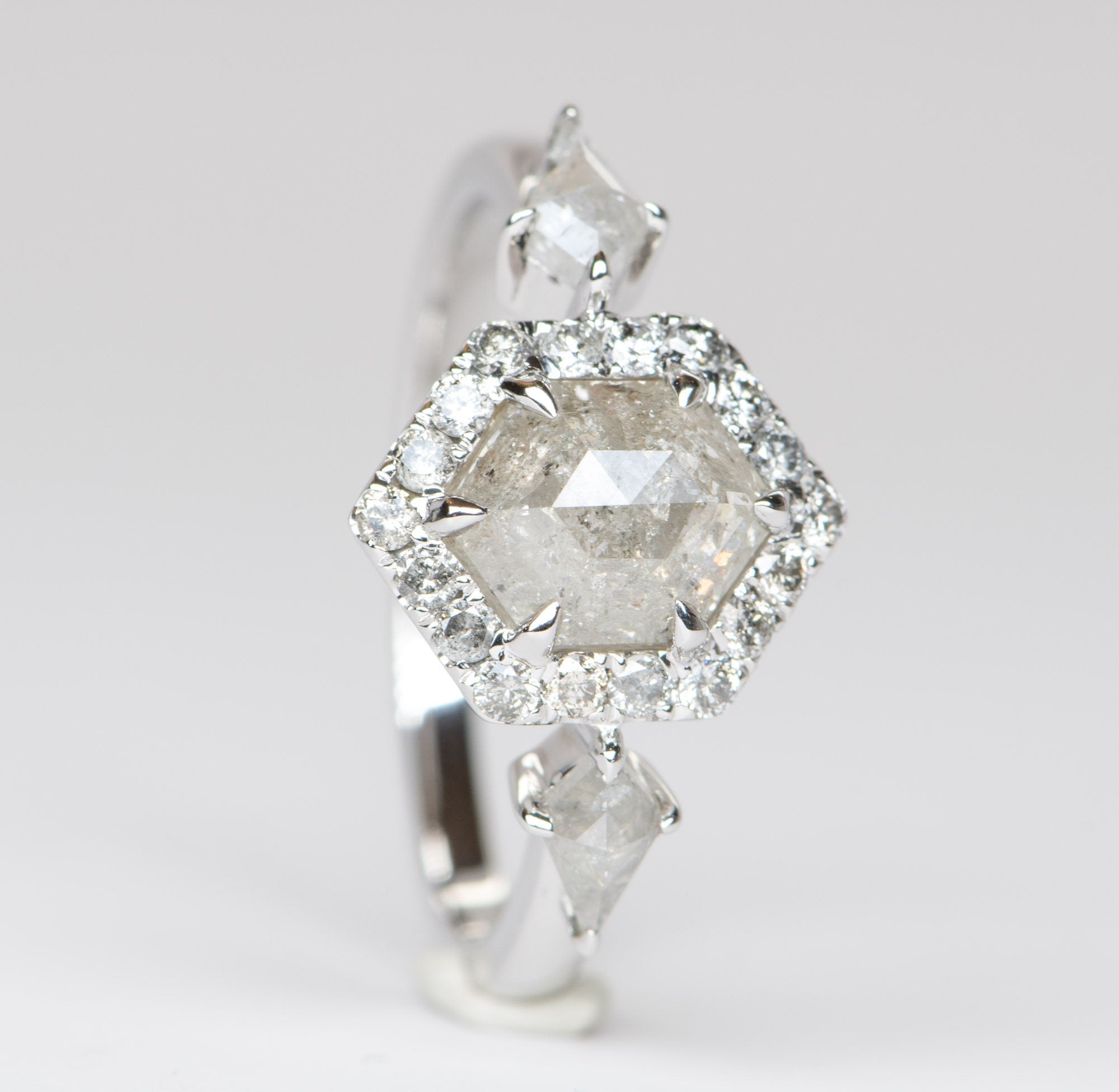 ♥ A beautiful milky gray hexagon shaped salt and pepper diamond center with diamond halo; accented with kite-shape diamonds on sides