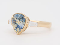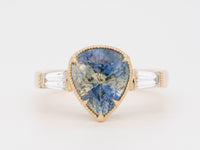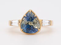 ♥ This ring features a gorgeous pear sapphire in the center, set on a diamond baguette band. Classic design!