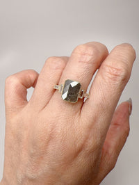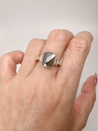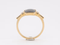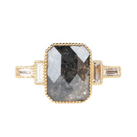 Center stone is a large salt and pepper diamond with baguette side stones set in a beautiful milgrain edging.