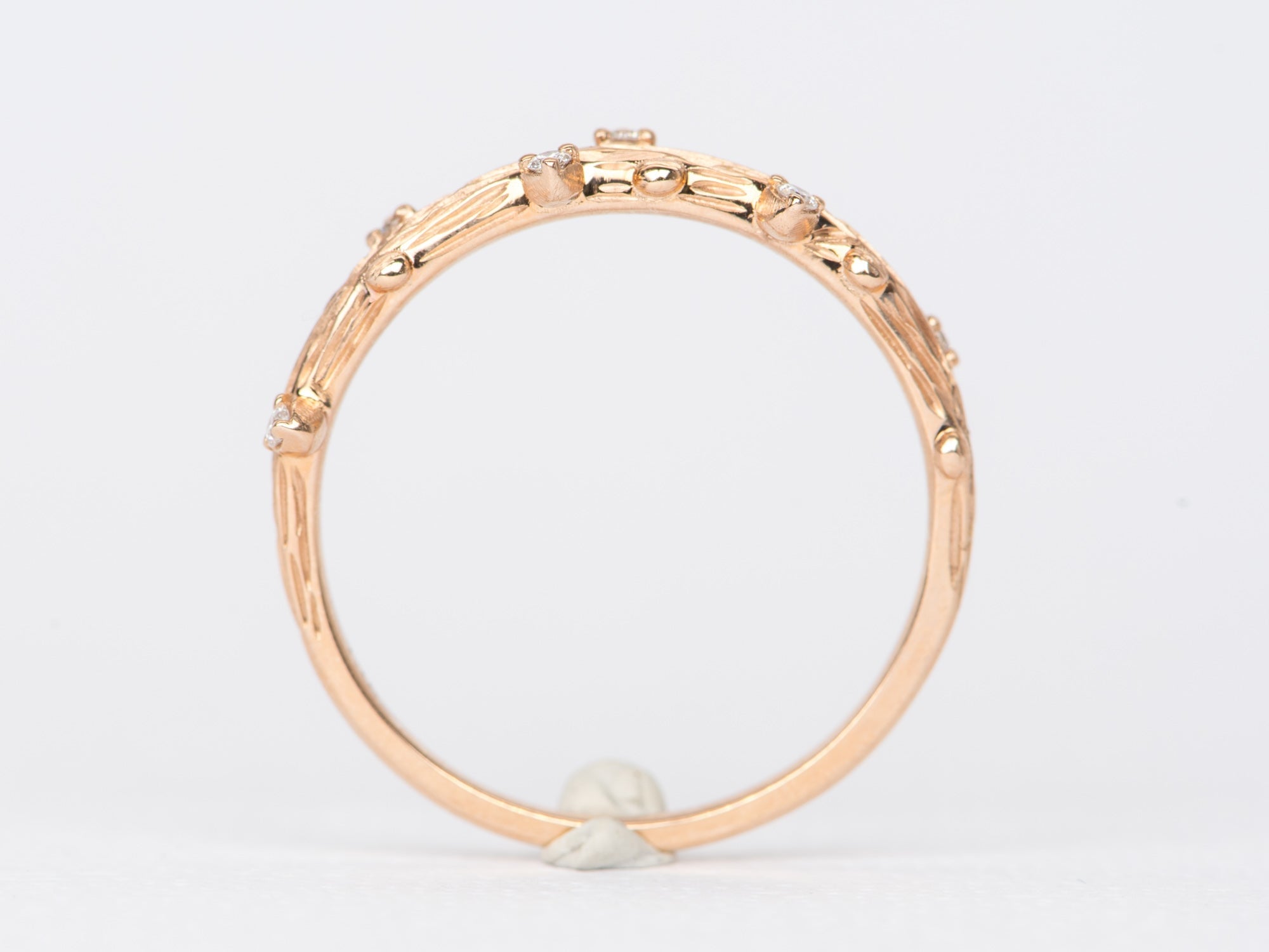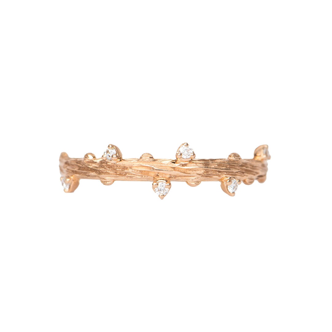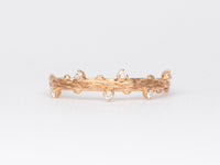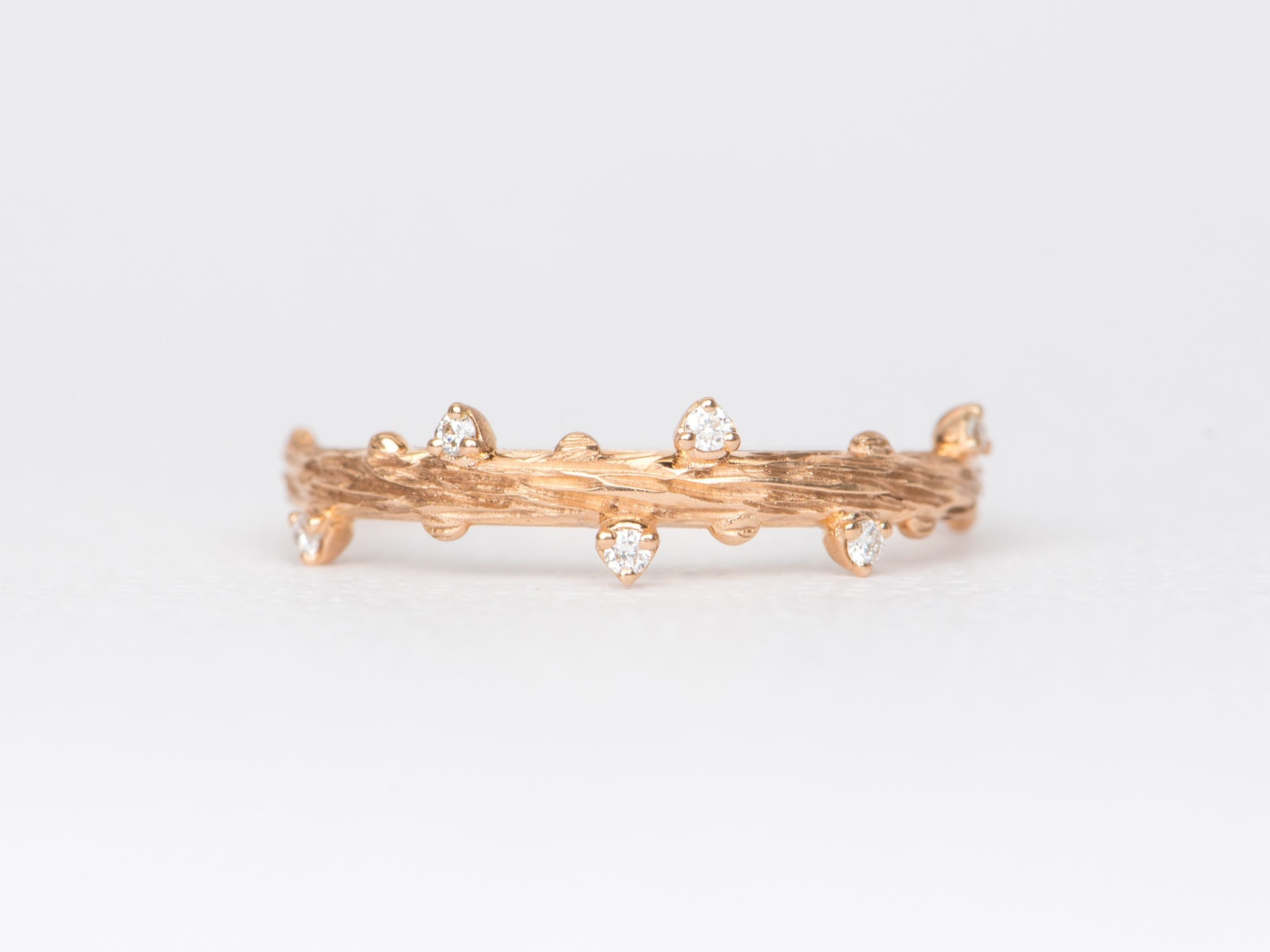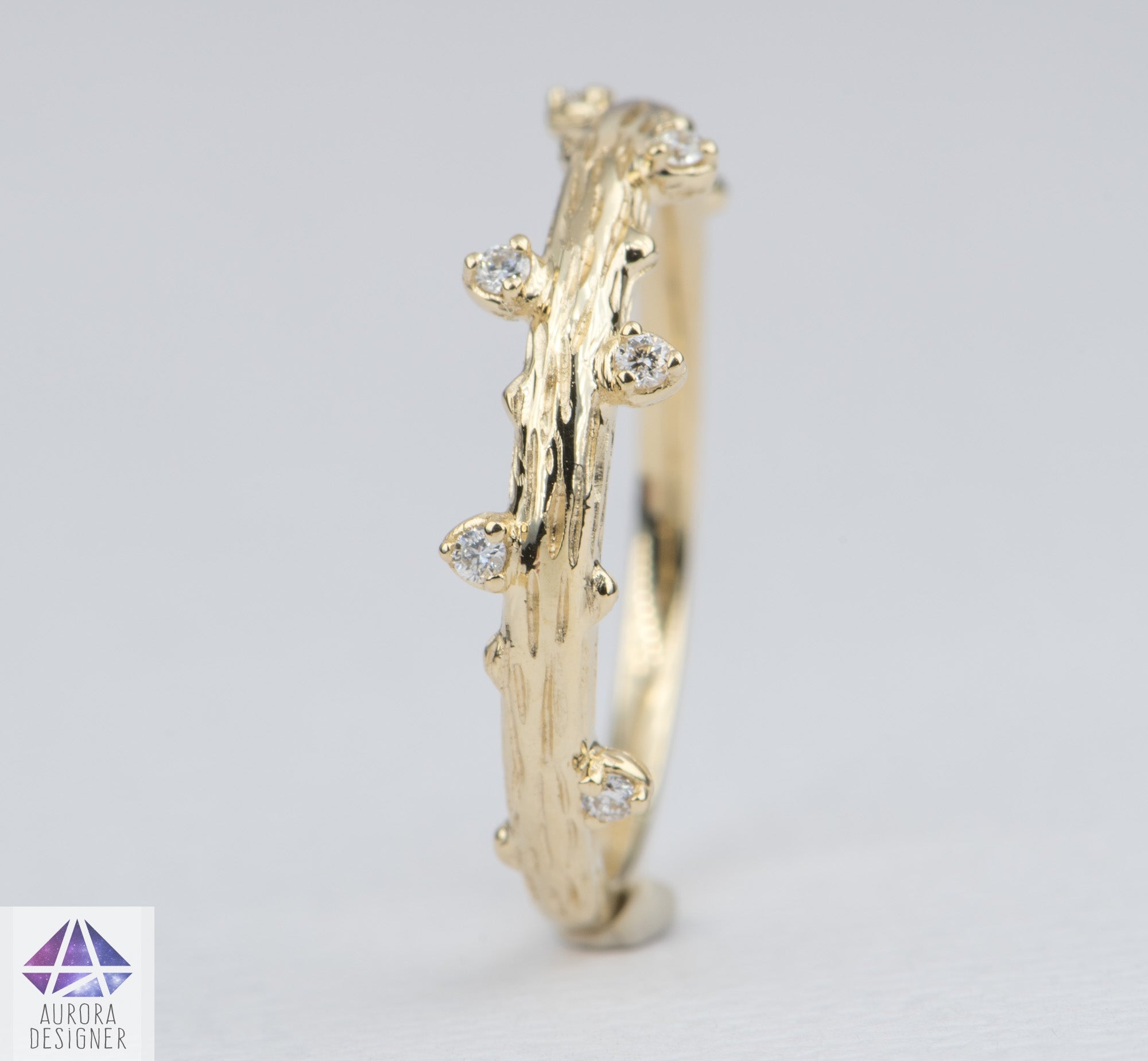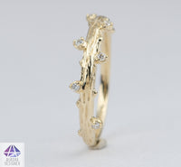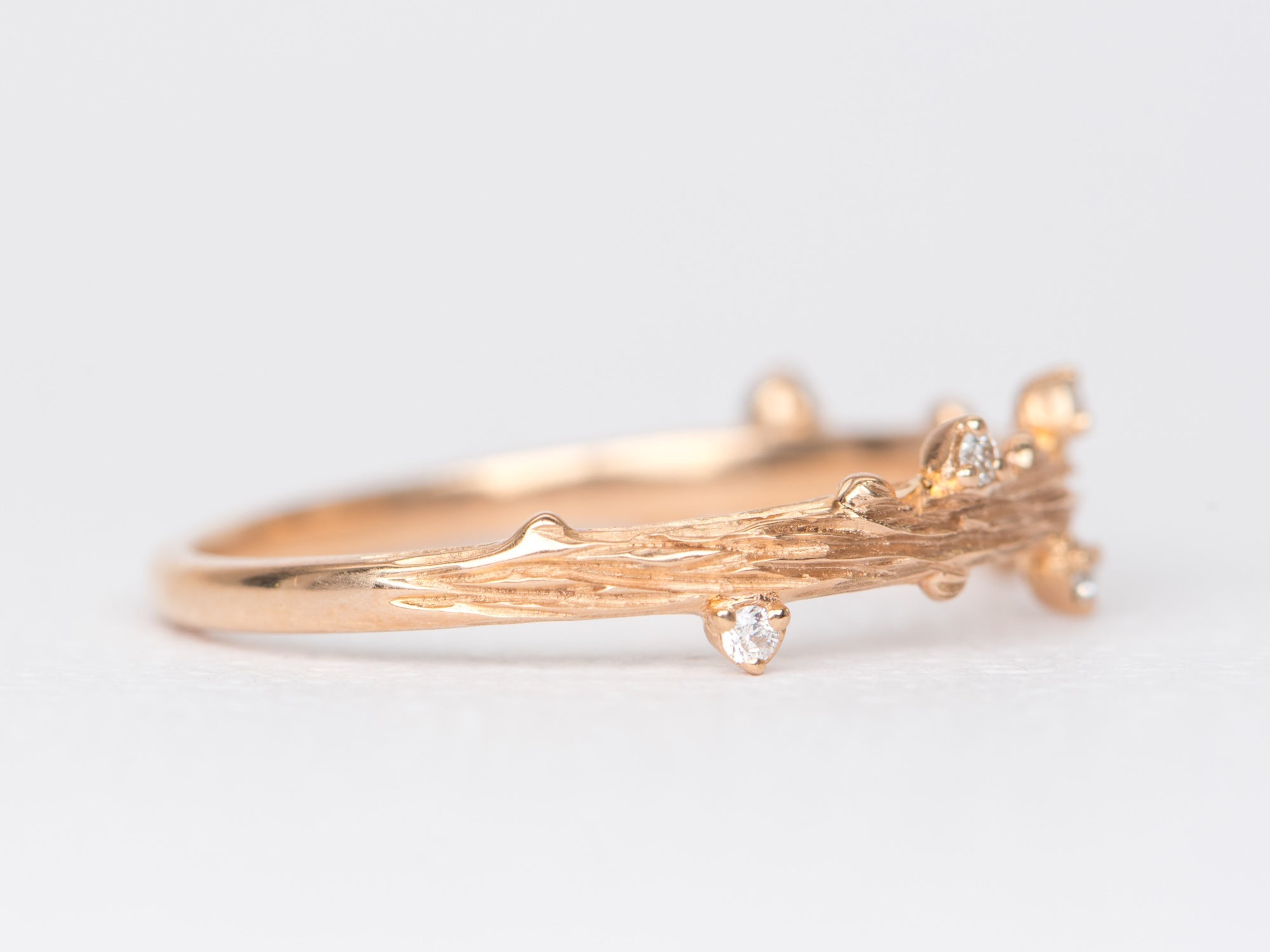 ♥ Delicate carved branch/twig ring set with 6 diamonds on 6 small "thorns" protruding from the branch. The inspiration is from the thorns on rose branches, both beautiful yet strong