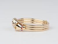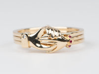 ♥ Our version of the Gimmel (Fede) ring is made from solid 14K gold, with one hand designed in a more feminine form with a cuff set with rubies, and the other hand designed in a more masculine form with a cuff set with a single diamond