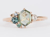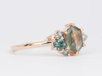 A stunning and unique ring that features a hexagonal Montana sapphire surrounded by natural Alexandrite and diamond clusters. The hexagonal shape of the sapphire adds an extra element of uniqueness and personality to the piece.