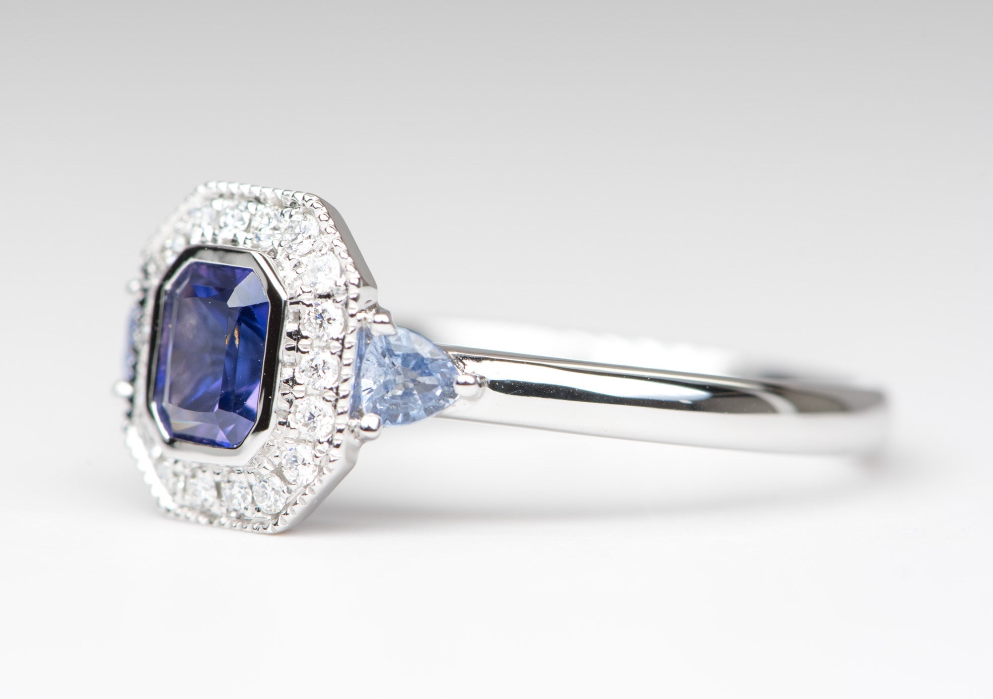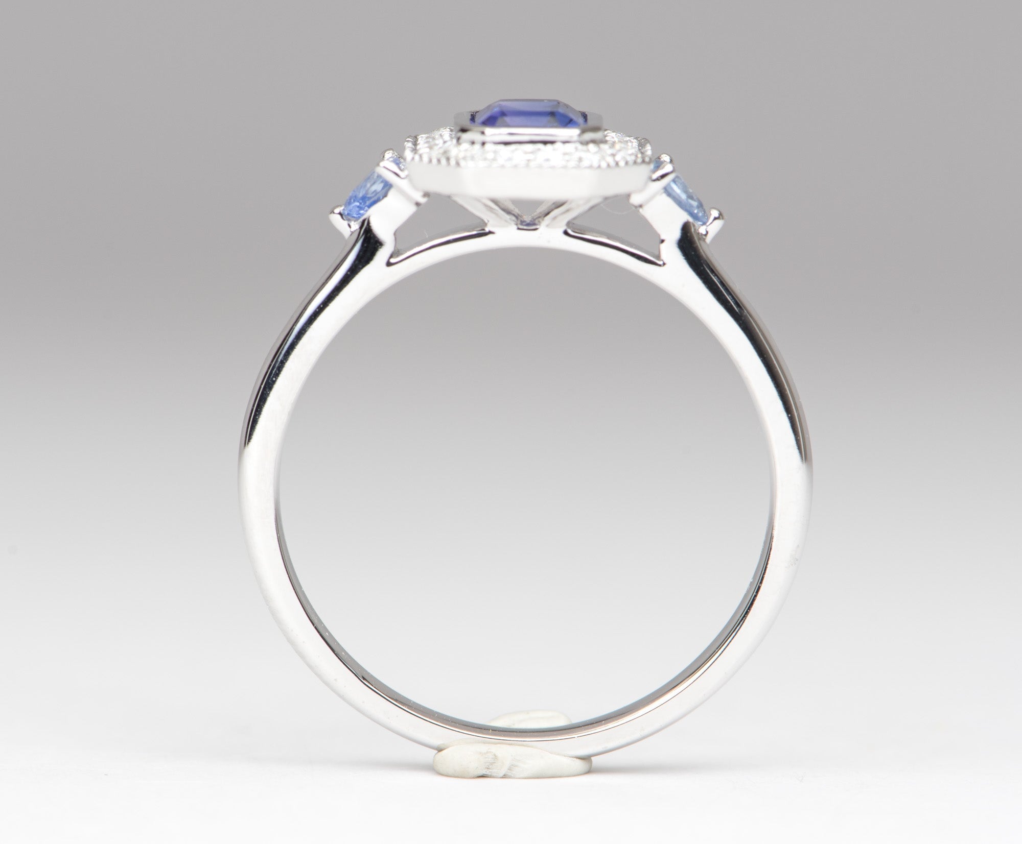 ♥ Gemstone: Blue sapphire center 0.56ct, Diamonds weigh 0.144ct, side sapphires weigh 0.18ct