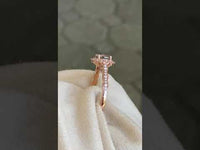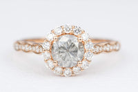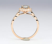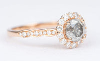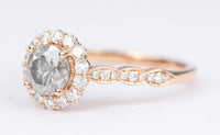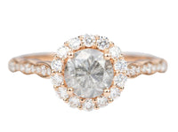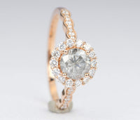 ♥ Solid 14K rose gold ring set with a round brilliant diamond in the center, then surrounded with a halo of white diamonds and a scallop style band set with sparkling diamonds