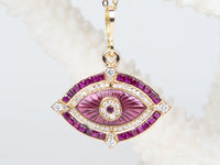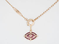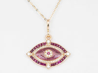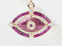 ♥ A solid 18K gold evil eye pendant featuring gorgeous princess-cut rubies and diamonds